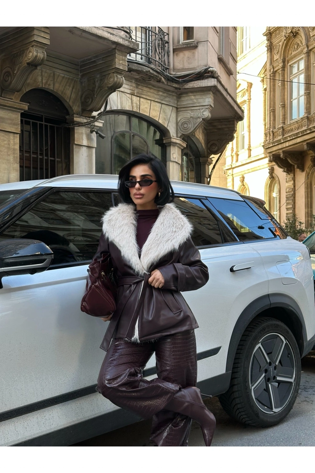 Kadın Yeni Sezon İçi Yumuşak Tüylü Detaylı Kemerli Deri Ceket