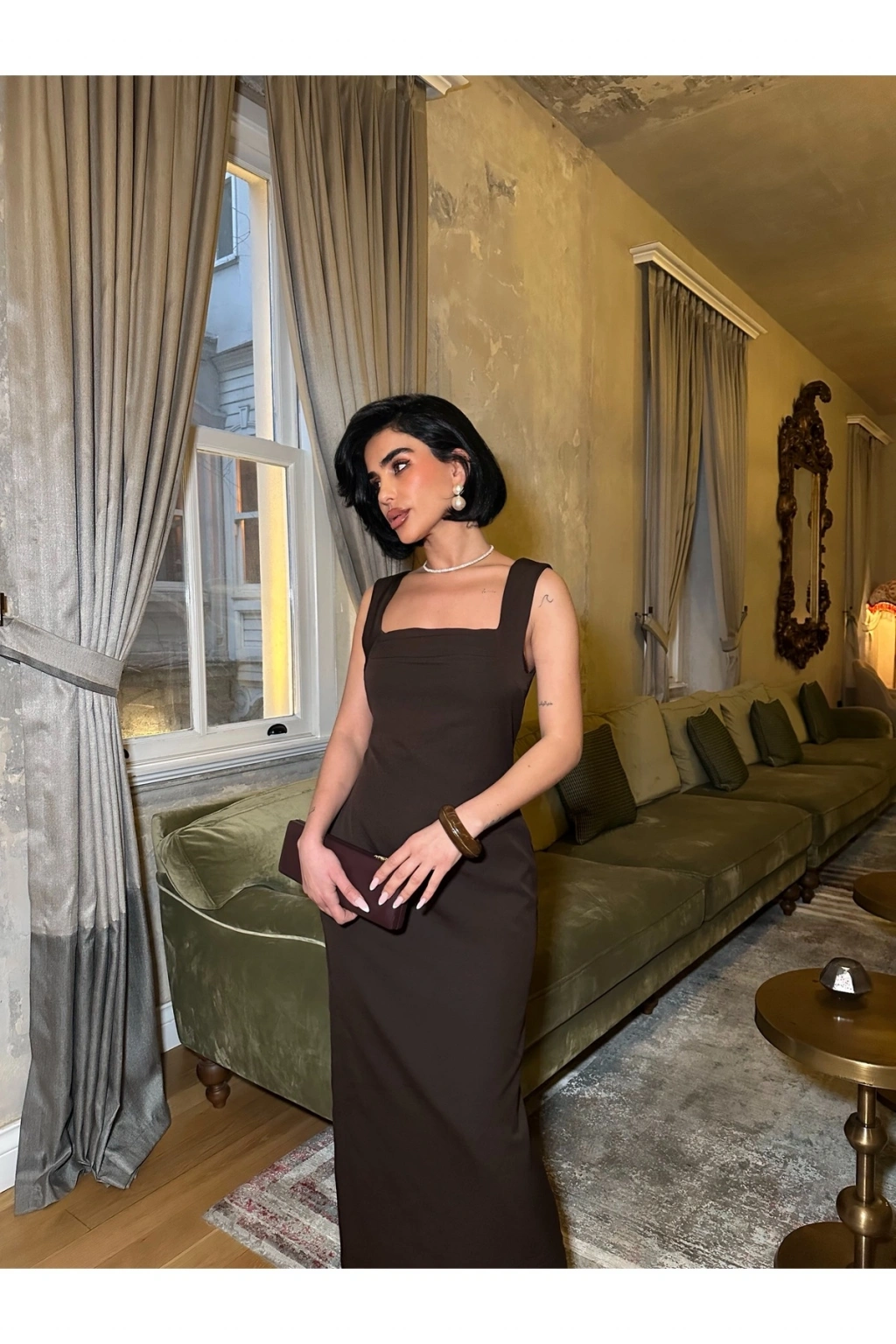 Kadın Kare Yaka Kalın Askı Tasarım Midi Boy Elbise